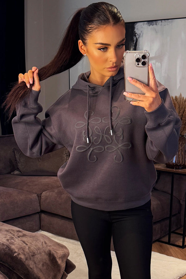 Hoodie with swirl embossed detail. This oversized hoodie is going to be perfect for your loungewear wardrobe. Featuring hooded sweatshirt with embossed swirl detail on the front kangaroo pockets fleece...