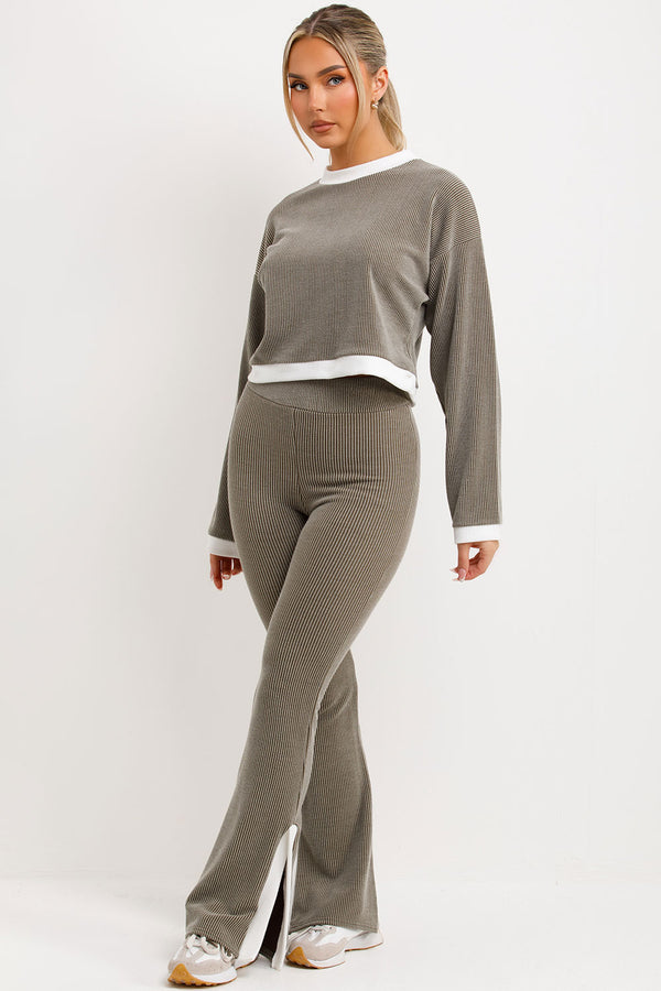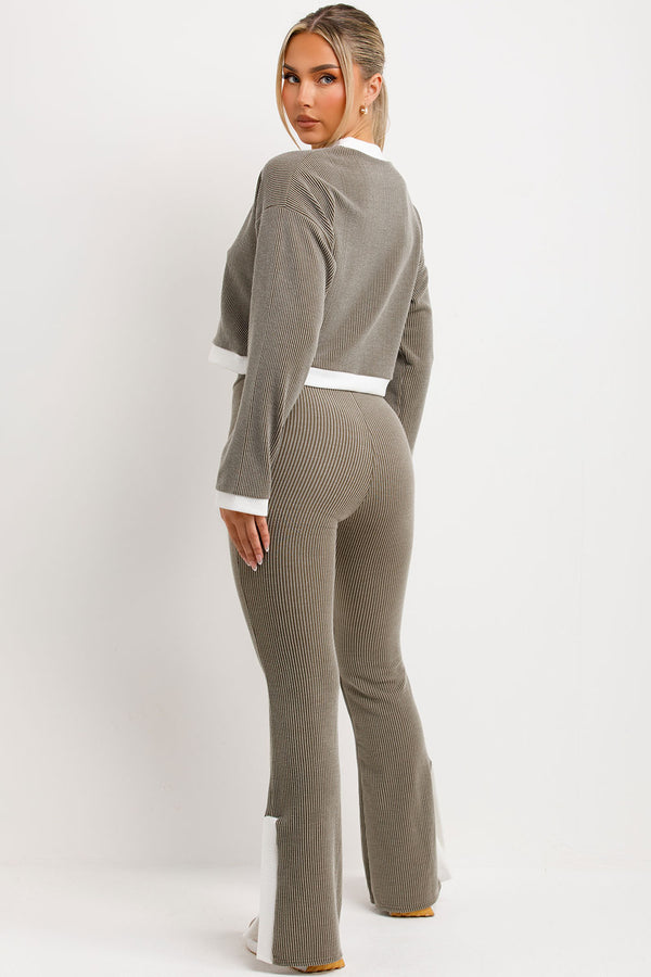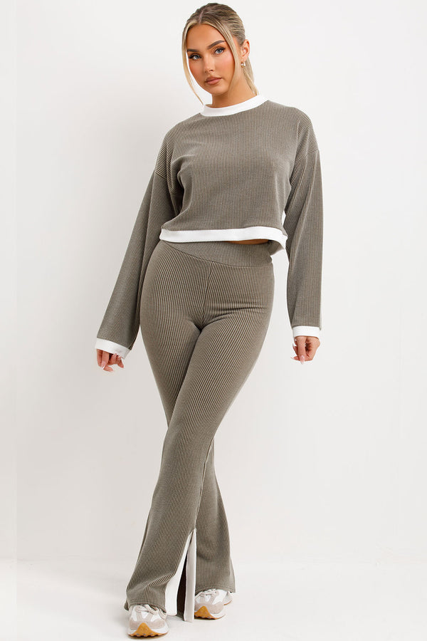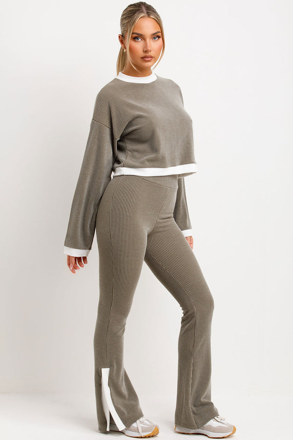 Jumper And Trousers Loungewear Set With Contrast Stripe Split Detail Khaki