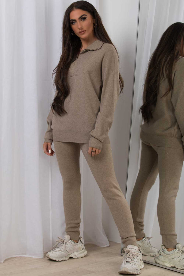 Knitted lounge set with half zip jumper. This knitted loungewear set is perfect for casual days in this new season. Featuring warm fine knit half zip jumper and elasticated waist...
