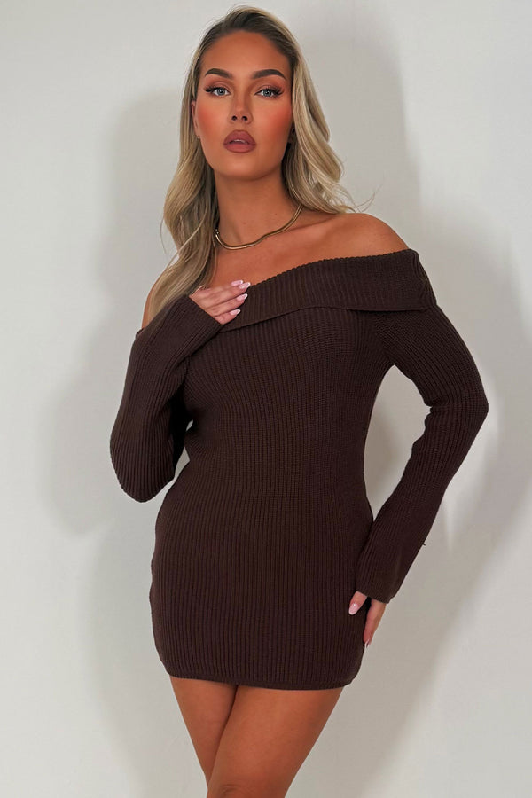 Knitted Off Shoulder Jumper Dress With Long Sleeves Brown