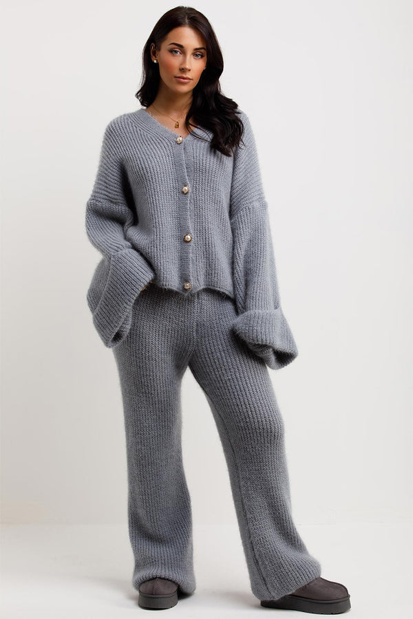 Knitted Oversized Cardigan With Buttons And Trousers Co Ord Grey