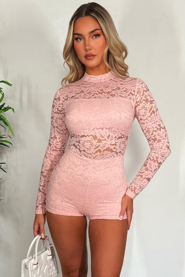 Lace Playsuit With Long Sleeves Pink