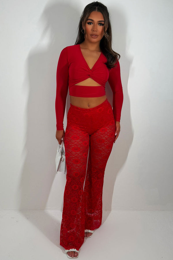 Lace trousers with skinny flared leg. These high waist flared lace trousers are perfect for you to complete your new season festival outfit. Featuring sheer lace high waist trousers with...