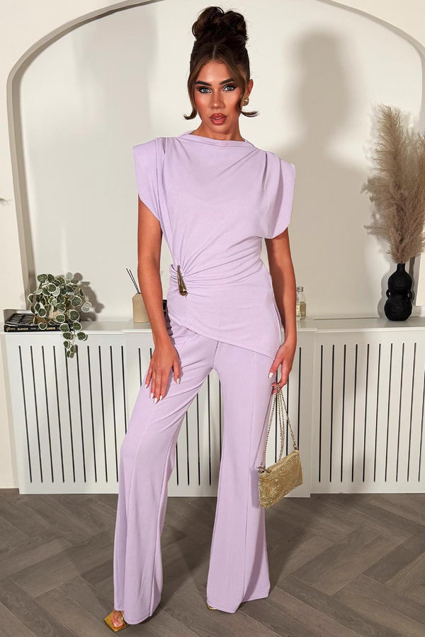 Lilac Wide Leg Trouser & Shoulder Pad Top Co Ord With Gold Buckle Detail