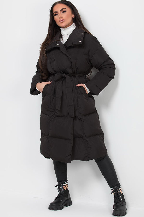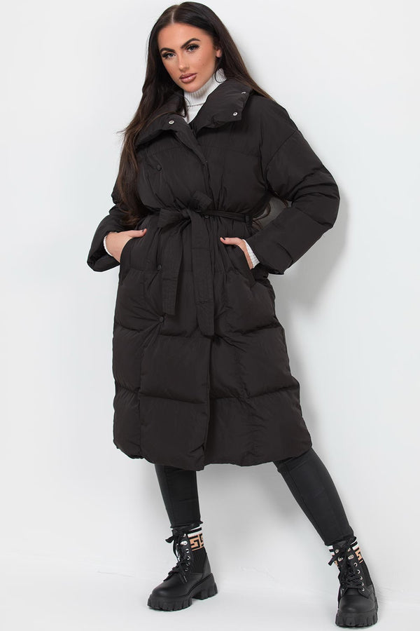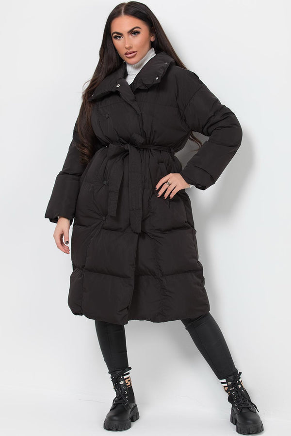 Long puffer coat with waist belt. This duvet coat is going to keep you warm and cosy in all seasons. This long padded puffer coat features duvet style button fastening...