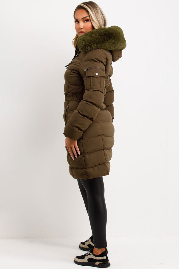 Long puffer coat with fur hood and belt. This puffer coat with belt is a must have for your outerwear wardrobe. Featuring longline puffer padded coat with elasticated waist belt...
