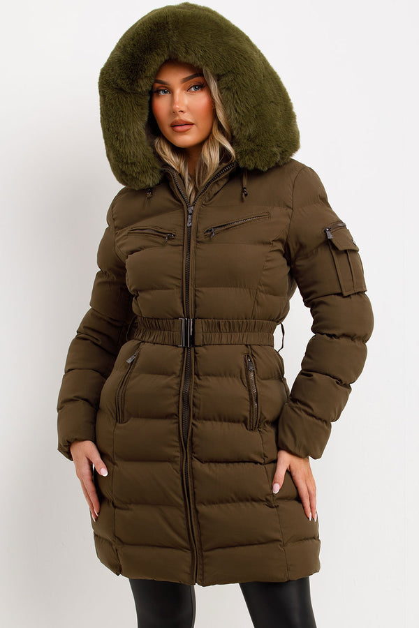 Long Puffer Coat With Fur Hood And Belt Khaki