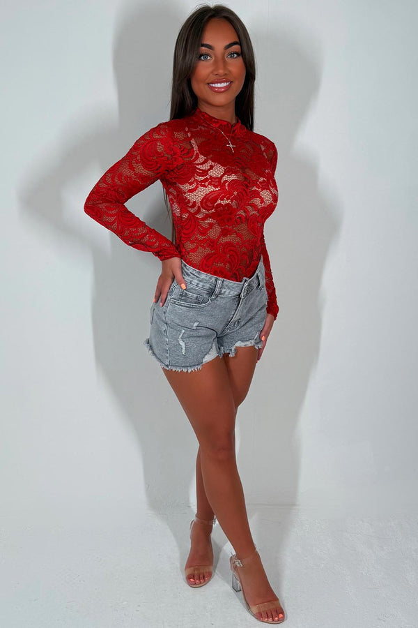 Long sleeve lace bodysuit top. This long sleeve lace top is going to give you an unforgettable look babe. Featuring sheer lace long sleeve bodysuit top , perfect to finish...