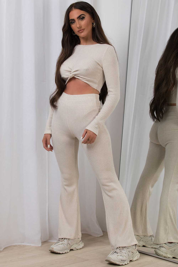 Loungewear set with knot front. This lounge set is going to give you fully chilled out look. Featuring fine rib stretch fabric long sleeve top with knot detail and matching...