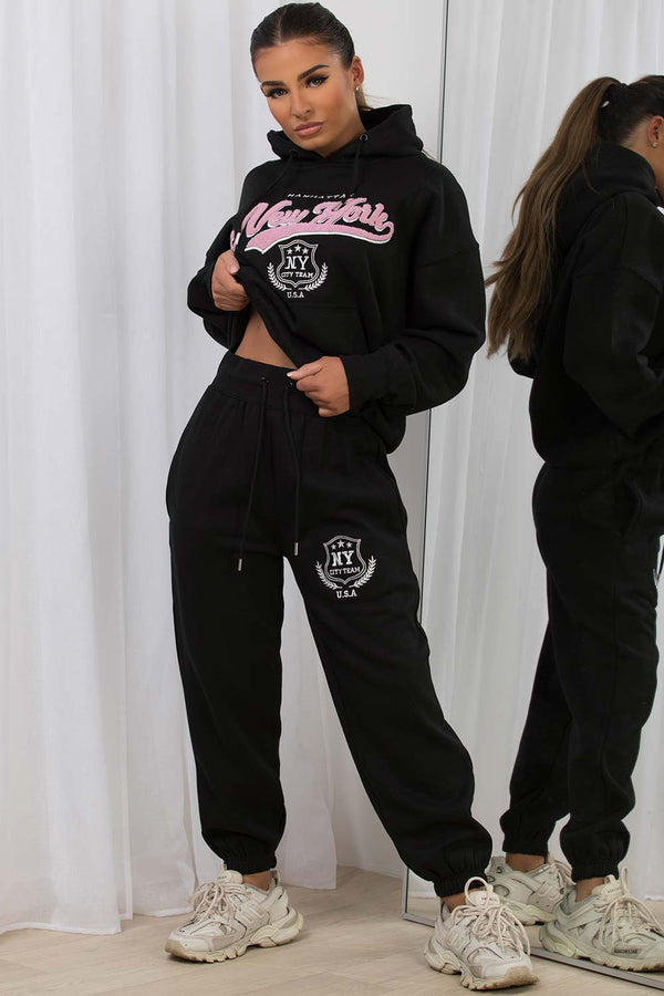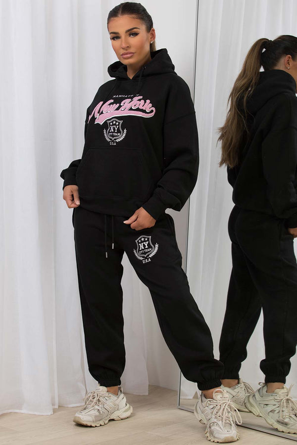 Loungewear set with New York embroidery. Casual wear never looked so good with this oversized hoodie and joggers set. Featuring hoodie and high waisted joggers set with New York towelling...
