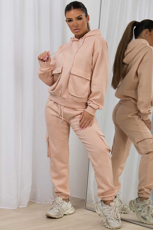 Loungewear set with utility pockets. This lounge set is going to add comfort to your casual wear wardrobe. Featuring joggers with utility pockets and matching hooded oversized top with utility...