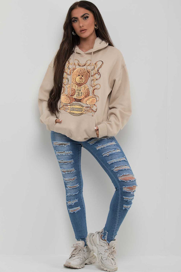 Oversized hoodie with mischief & teddy graphic print. This teddy hooded sweatshirt will be your new wardrobe essential for this new season. Featuring oversized hoodie with designer inspired teddy bear graphic...