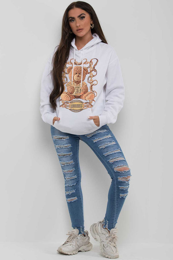 White oversized hoodie with mischief & teddy graphic print. This teddy hooded sweatshirt will be your new wardrobe essential for this new season. Featuring oversized hoodie with designer inspired teddy bear graphic...