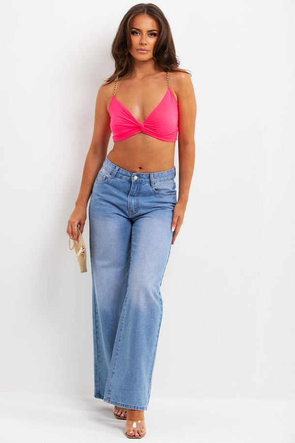 Neon Pink Crop Top With Twist Front And Gold Chain Straps