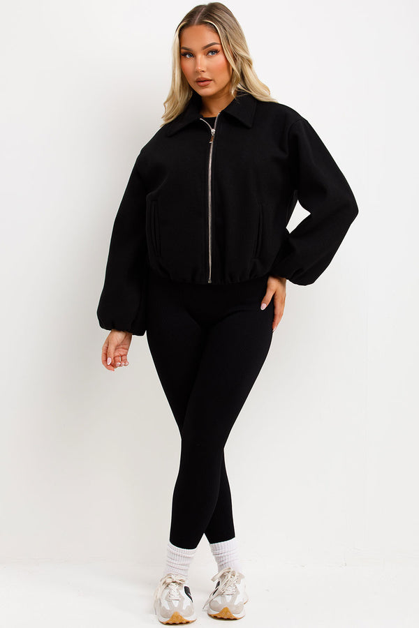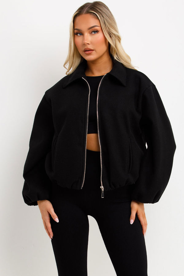 Puffed bomber jacket with zip. Bomber jacket with lapel collar long sleeves zip fastening double welt front pockets and puffed elasticated waist and trims, really comfy and cosy jacket. Style...