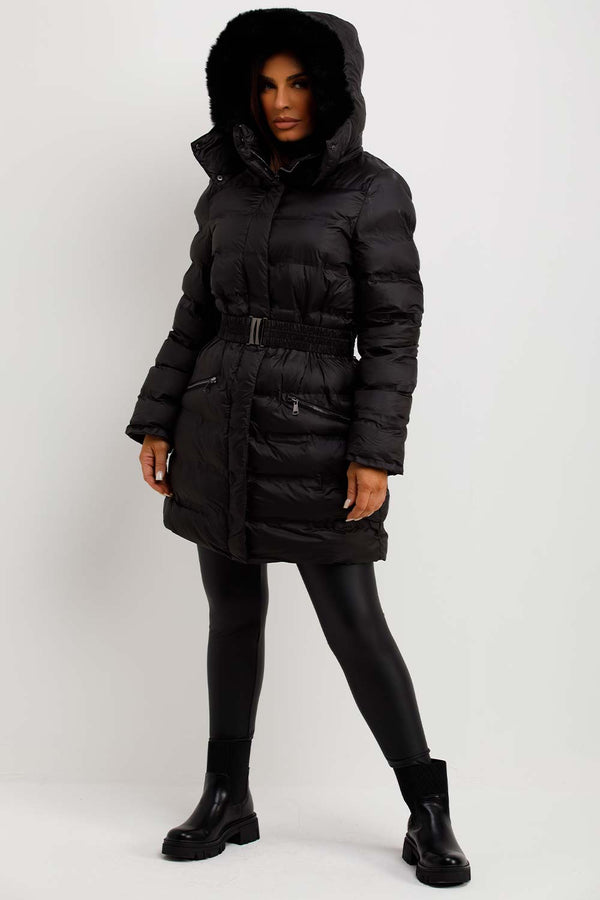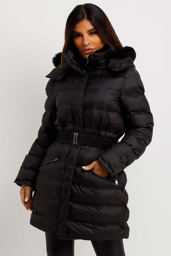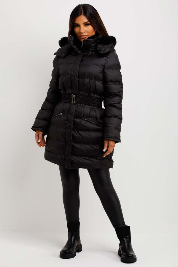 Puffer padded coat with fur hood and belt. This belted puffer coat is going to keep you warm and cosy and its perfect addition to your outerwear wardrobe. Featuring puffer...