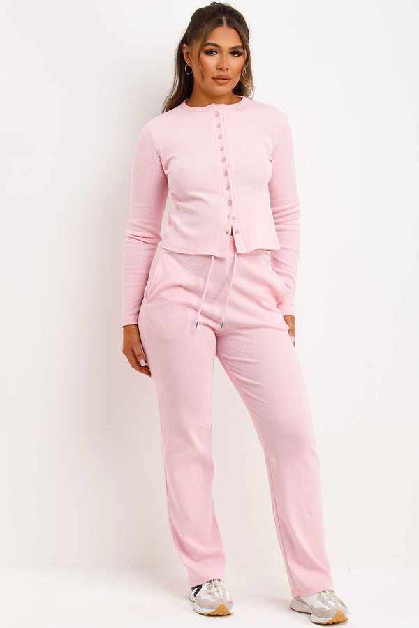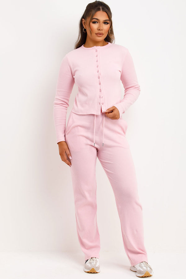 Rib Button Up Long Sleeve Top And Trouser Loungewear Set Pink