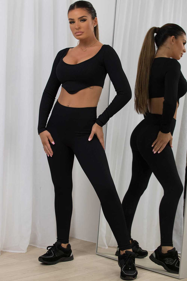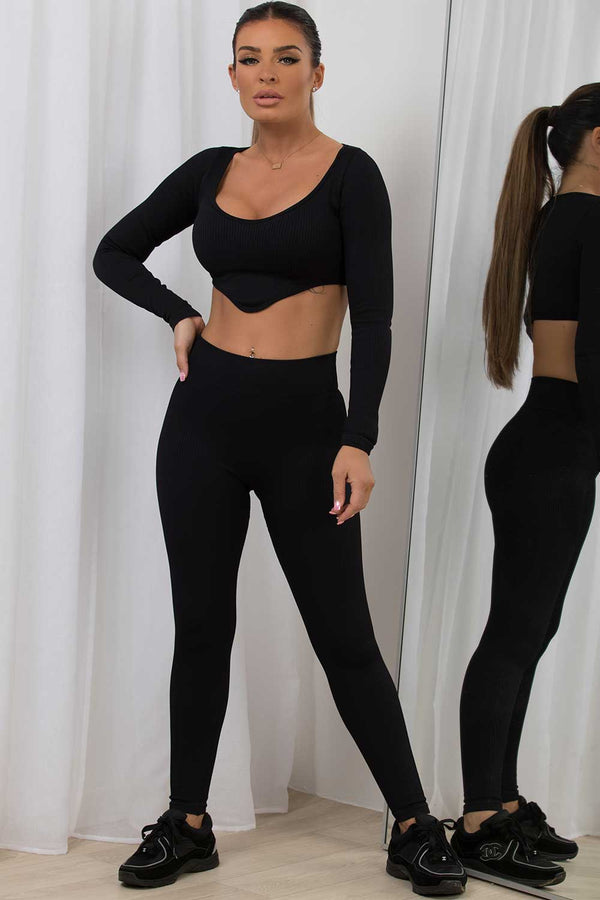Rib contour loungewear set. This lounge set is sure to become your everyday go to piece as gym wear or casual wear. Featuring rib contour long sleeve scoop neck crop...