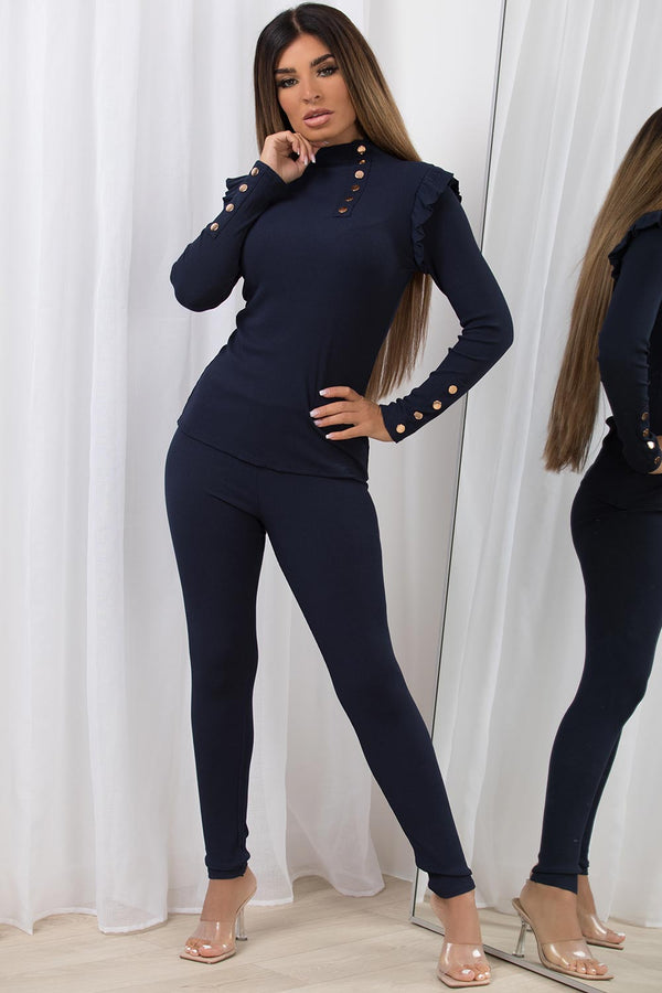 Ribbed Lounge Set With Gold Buttons And Frill Shoulder Navy