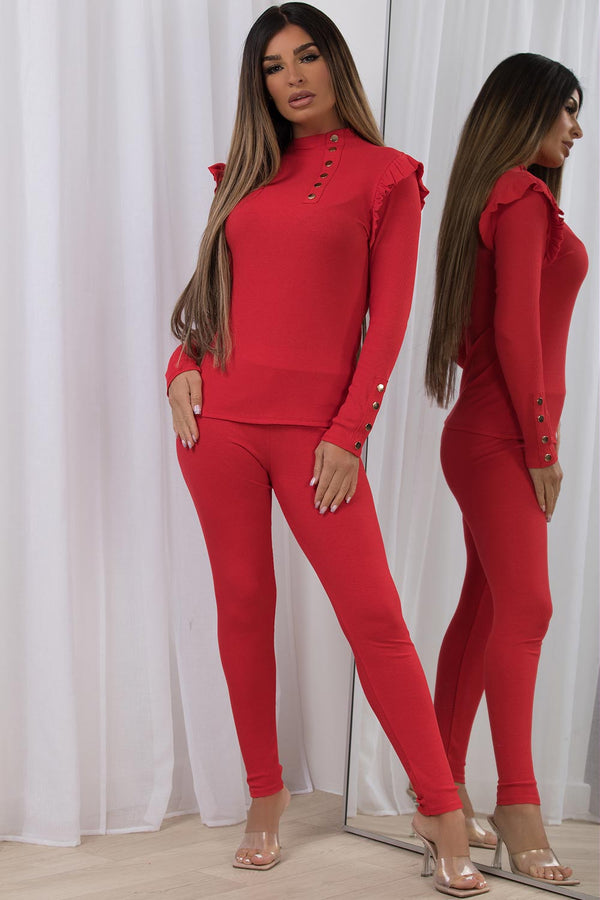 Ribbed Lounge Set With Gold Buttons And Frill Shoulder Red