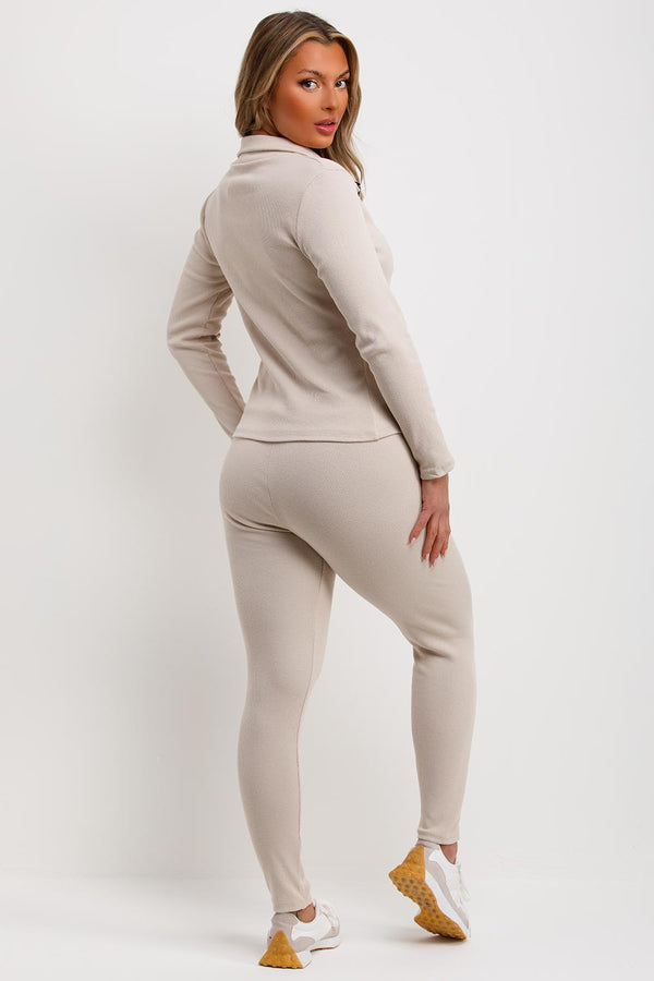 Ribbed Loungewear Set With Zip Up Detail Beige
