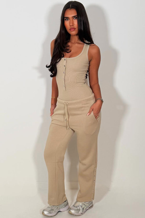 Ribbed Top And Joggers Lounge Set Co Ord With Button Up Detail Beige