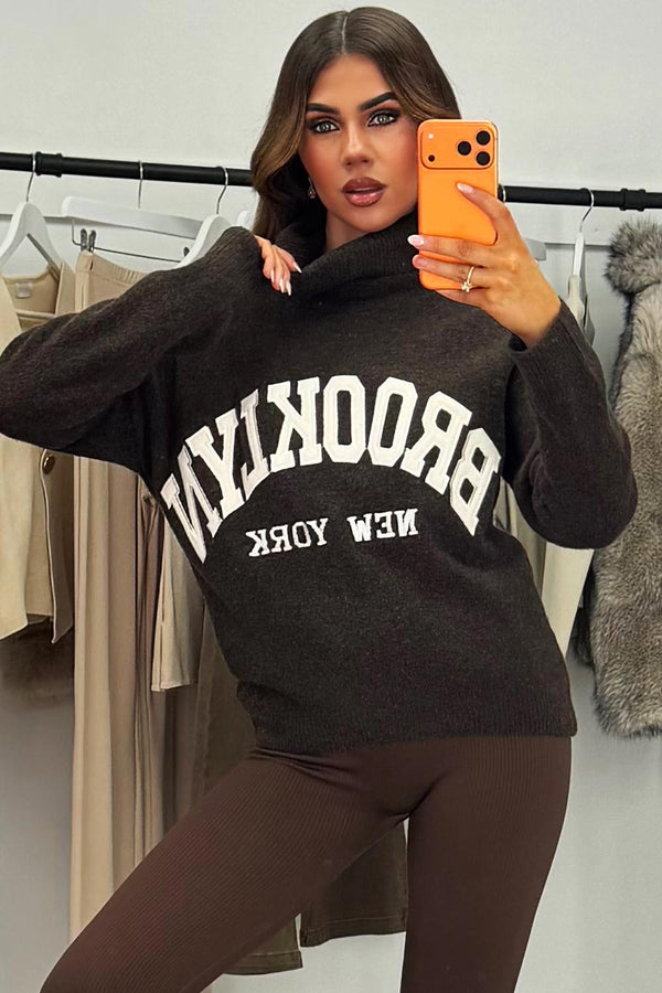 Roll Neck Jumper With Brooklyn Slogan Brown