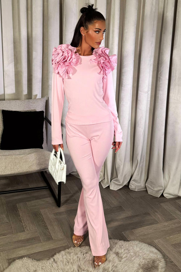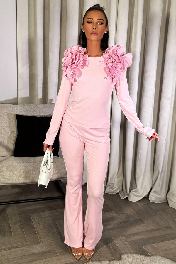 Ruffle Frill Shoulder Top And Trousers Co Ord Set Pink