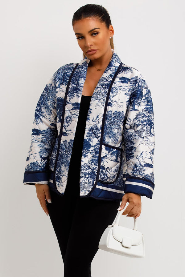 Satin Quilted Blazer Jacket With Jungle Print Blue