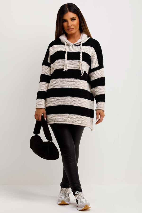 Striped chunky knit hooded jumper. This knitted jumper is going to keep you warm and comfy in this cosy season. Featuring chunky knit jumper with hood and bold stripes. Style...
