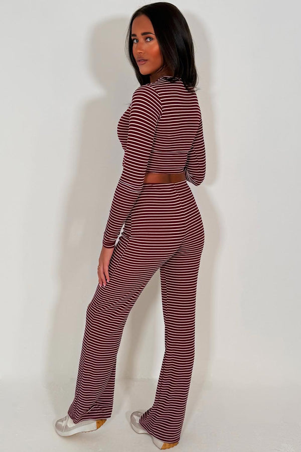 Striped lounge set co ord. Striped long sleeve top round neck with matching wide leg striped trouser elasticated waist. This contrast striped crop top and trouser lounge set is going...
