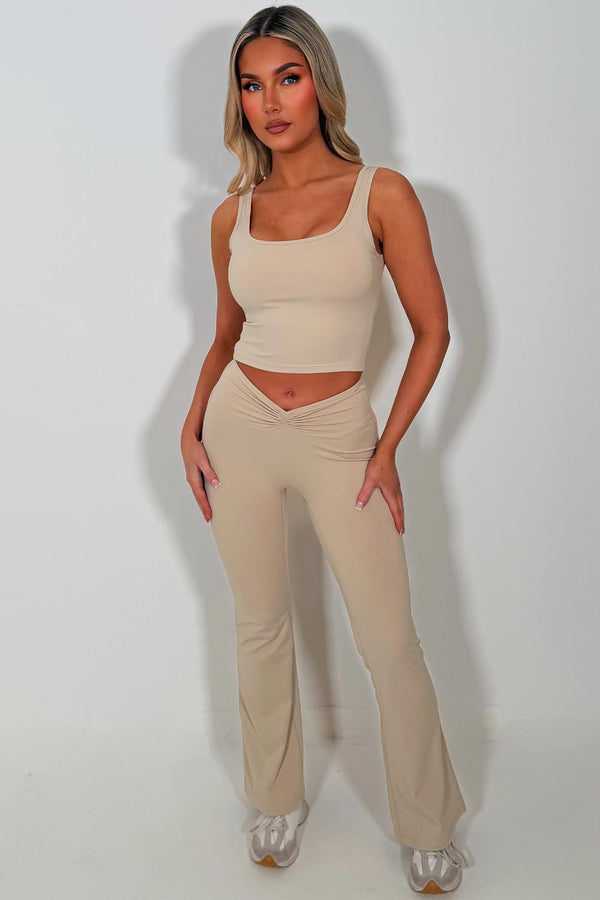 V Waist Compression Flare Yoga Leggings And Top Co Ord Set Beige