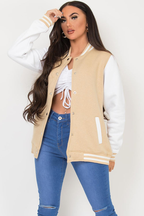 Varsity bomber baseball jacket. This bomber jacket is sure to elevate your casual game. Featuring varsity design contrast sleeves button fastening and pockets. Wear it with our high waisted jeans...
