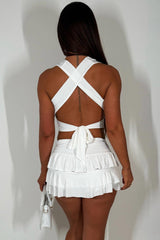White Halter Neck Backless Top And Ruffle Frilly Skirt Set