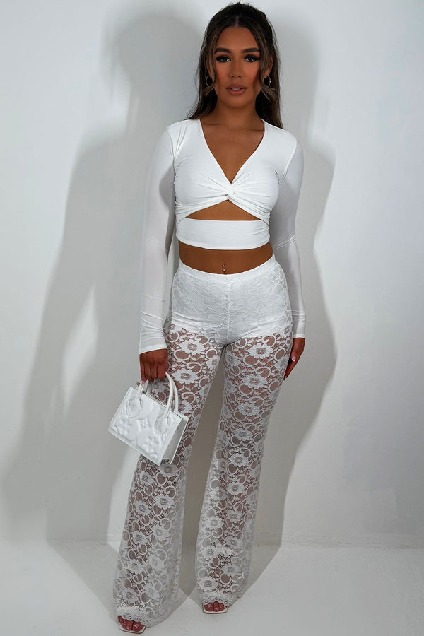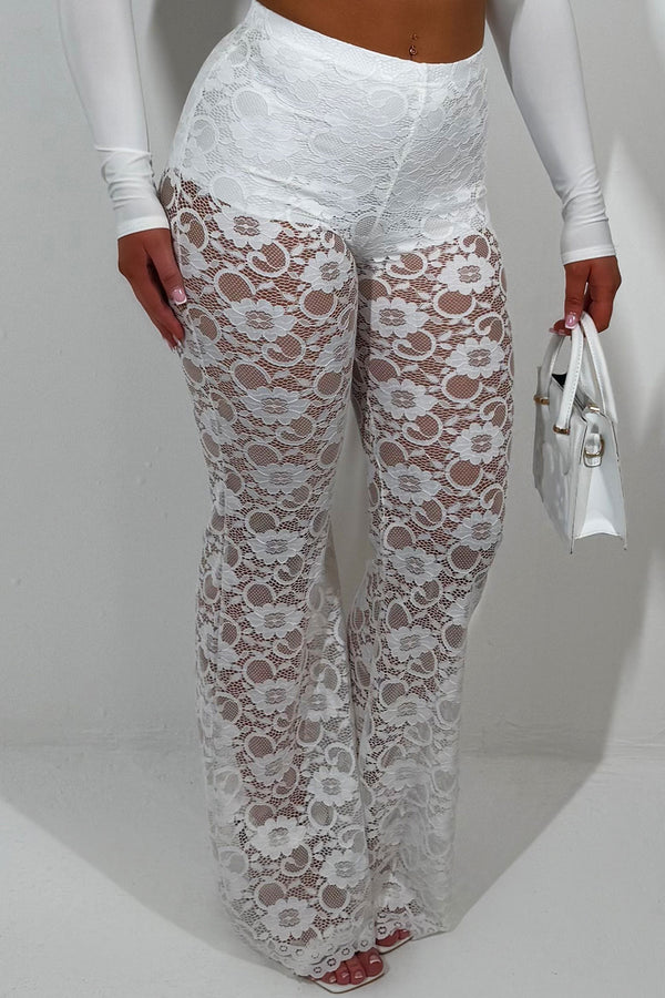 Lace trousers with skinny flared leg. These high waist flared lace trousers are perfect for you to complete your new season festival outfit. Featuring sheer lace high waist trousers with...