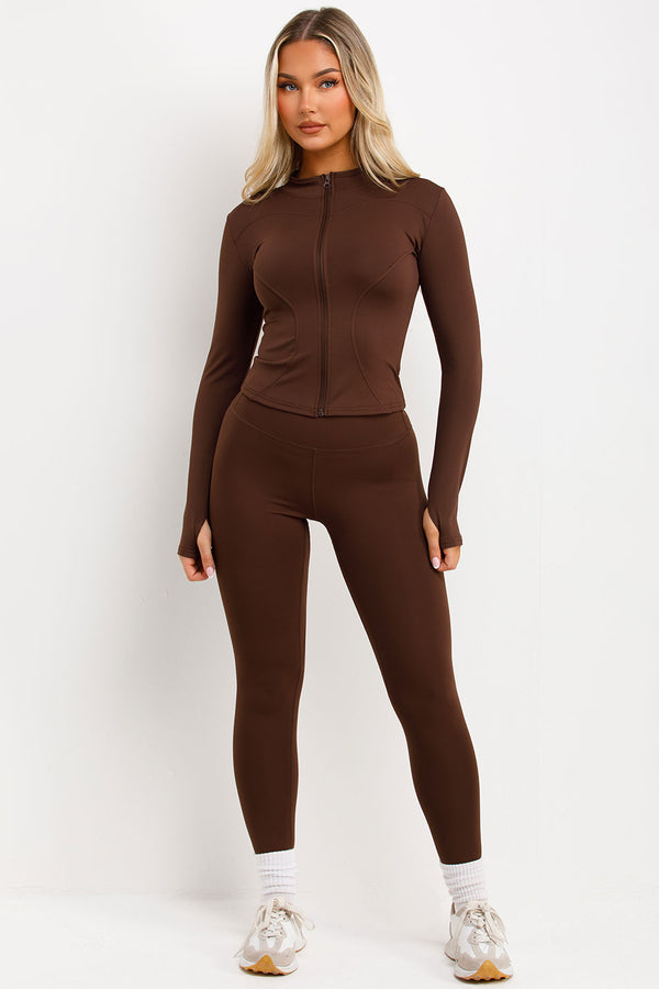 Zip Up Sports Jacket And Seamless Leggings Co Ord Set Brown