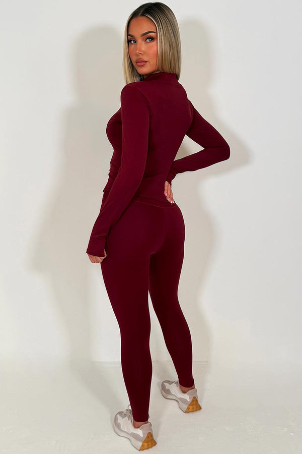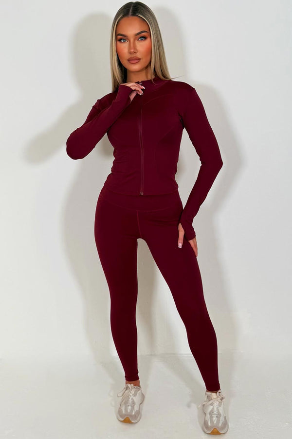 Zip Up Sports Jacket And Seamless Leggings Co Ord Set Burgundy