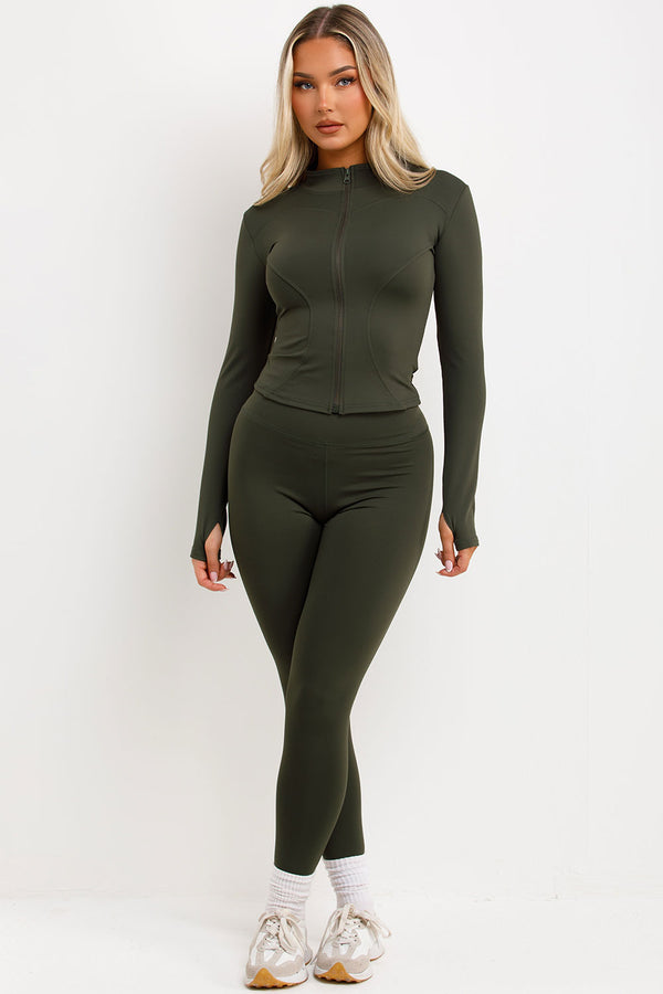 Zip Up Sports Jacket And Seamless Leggings Co Ord Set Khaki